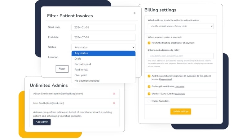 With free, unlimited clinic admin accounts, your team can easily handle your billing for you. Manage permissions to have each clinic admin be able to access and manage as much, or as little, as you need. Embodia’s intuitive interface was built with teams and usability in mind so you can focus on running your clinic.