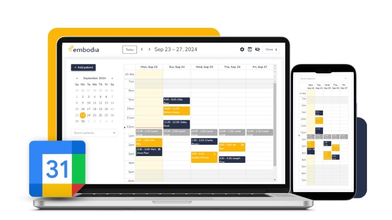 Stay organized with real-time updates across all devices on the Embodia platform and sync with Google Calendar. Appointments and schedules are synced instantly, giving you and your team access to the most current information and preventing double bookings.